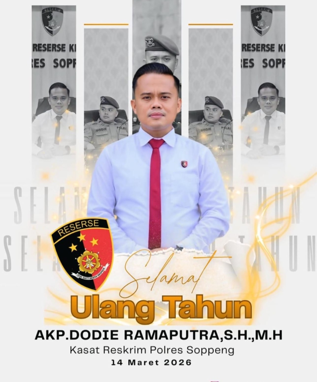 “Selamat ulang tahun yang ke-41 kepada Kasat Reskrim Polres Soppeng, AKP Dodie Rama Putra, SH., MH. Semoga dengan bertambahnya usia selalu mendapatkan lindungan dari Allah SWT, diberikan kesehatan serta dimudahkan dalam segala urusan, khususnya dalam menjalankan tugas pengabdian kepada masyarakat, bangsa, dan negara,” ujar Jamal.