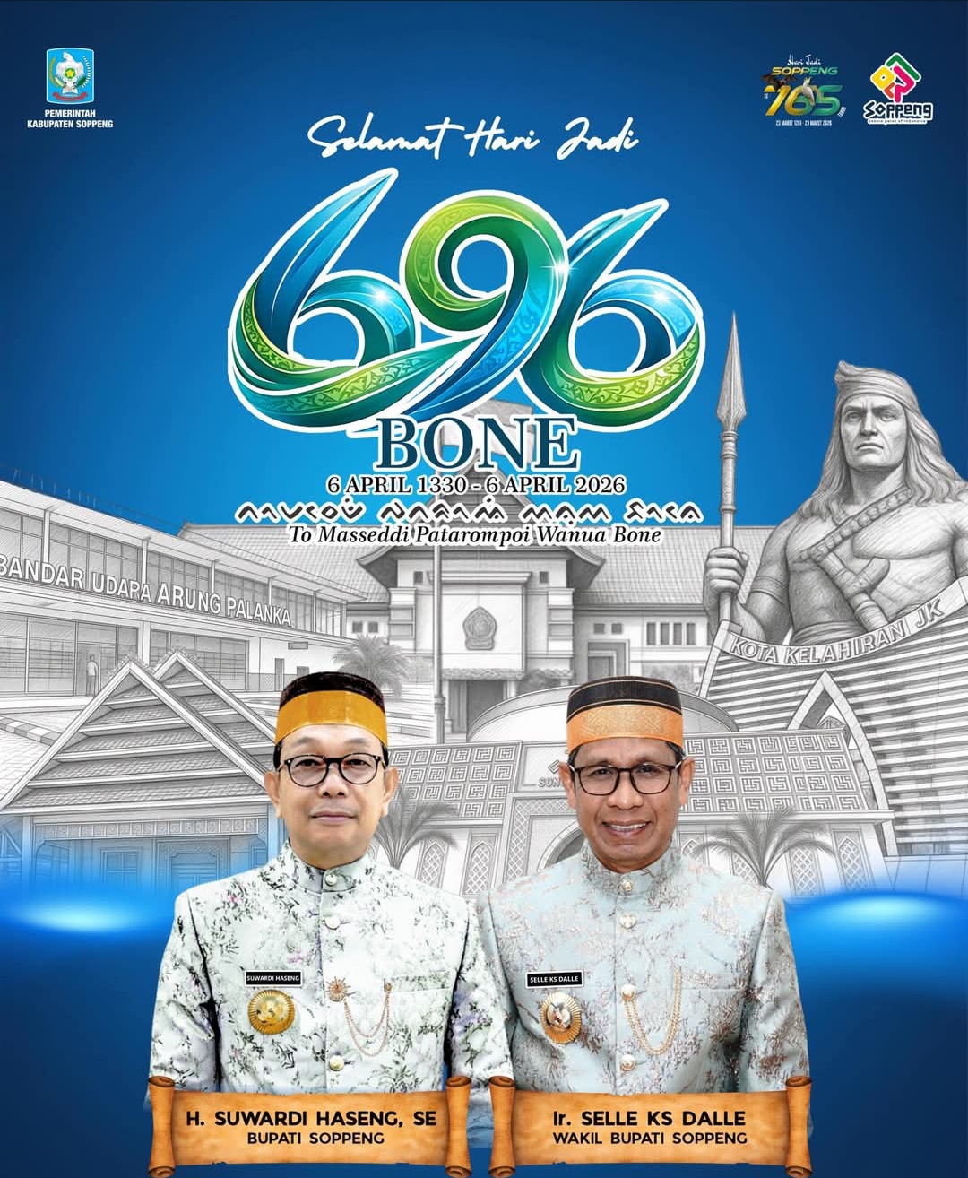 SOPPENG, Wartasimpul.com – Pemerintah Kabupaten Soppeng menyampaikan ucapan selamat dan sukses atas peringatan Hari Jadi Bone yang ke-696 Tahun.